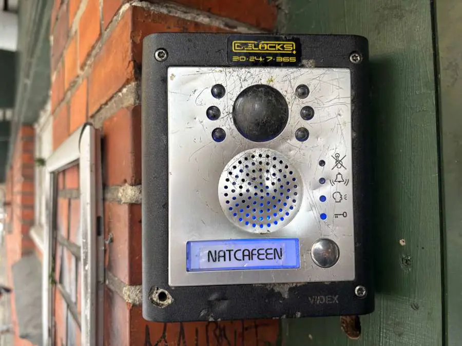 Via et kamera i dørtelefonen kan medarbejderne se, hvem der vil ind på Natcafeen. Maren Urban Swart