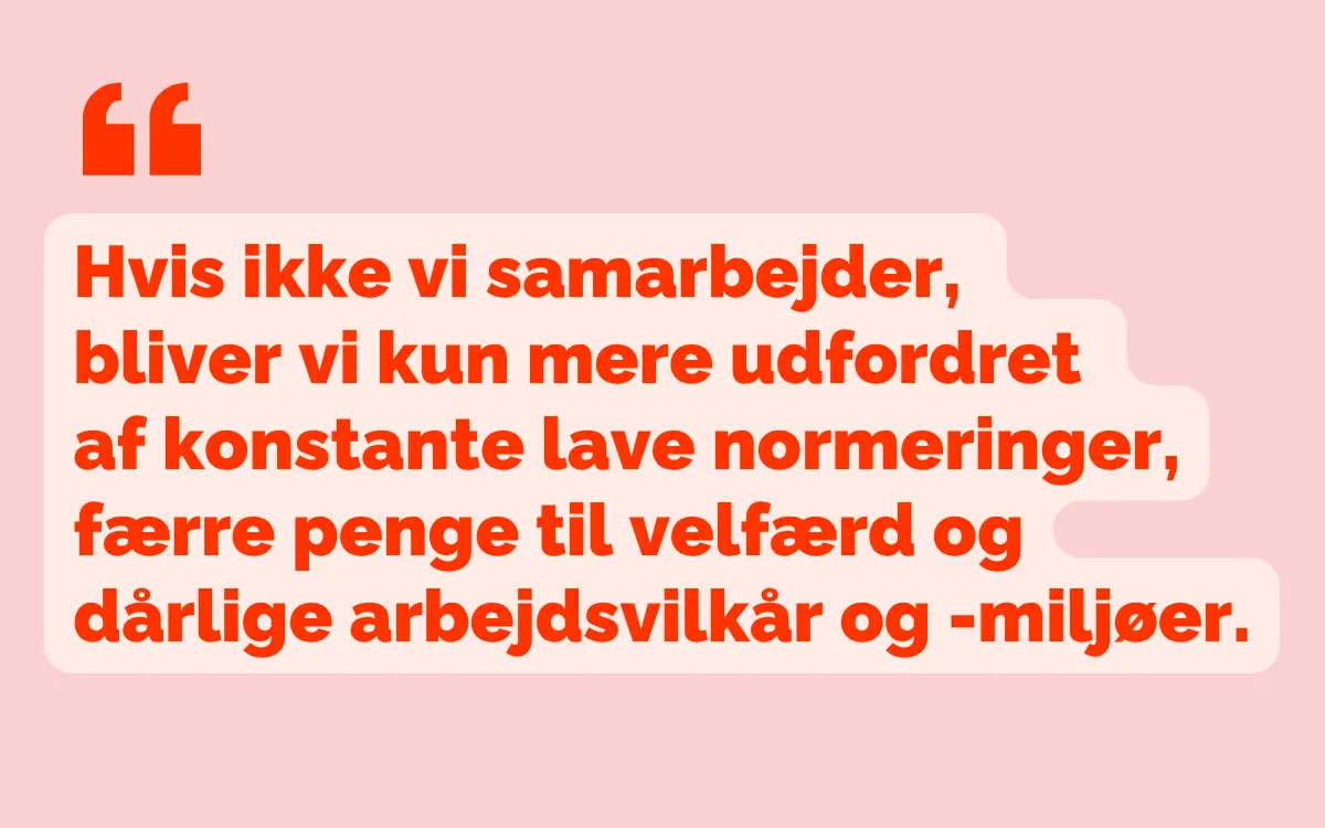Hvis ikke vi samarbejder, bliver vi kun mere udfordret af konstante lave normeringer, færre penge til velfærd og dårlige arbejdsvilkår og -miljøer.