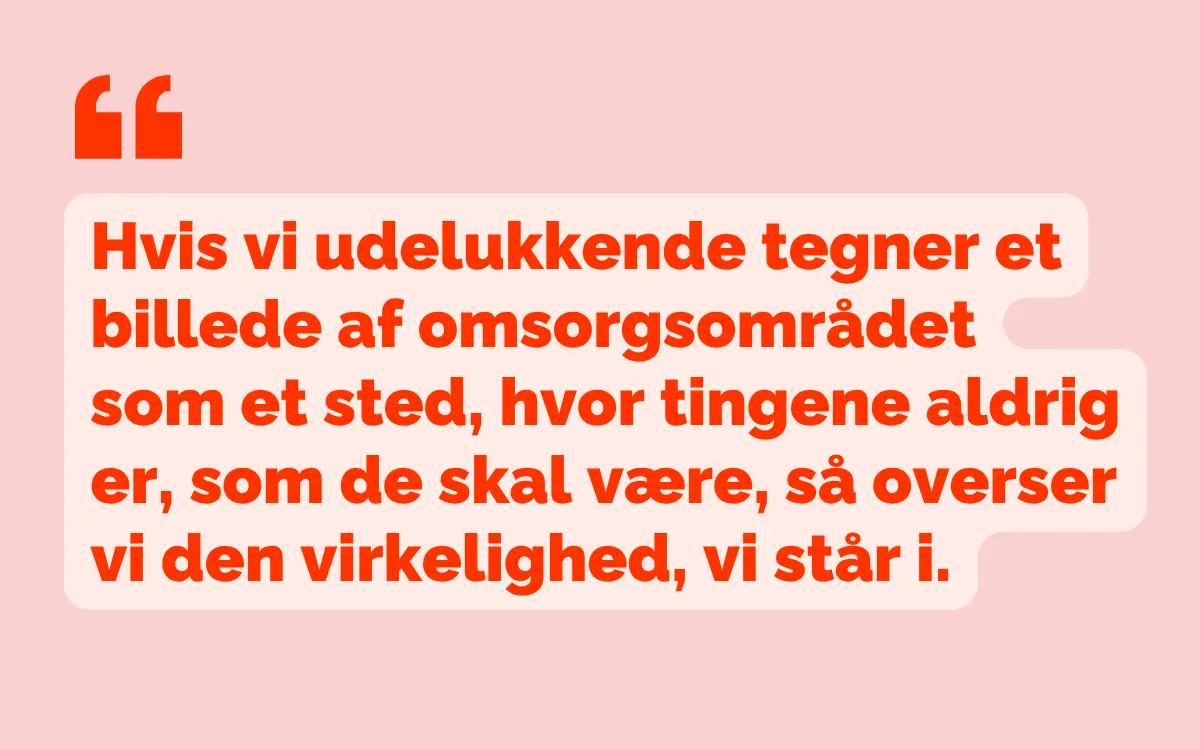 Men hvis vi udelukkende tegner et billede af omsorgsområdet som et sted, hvor tingene aldrig er, som de skal være, så overser vi den virkelighed, vi står i: At vi gør noget godt og livsvigtigt hver eneste dag.