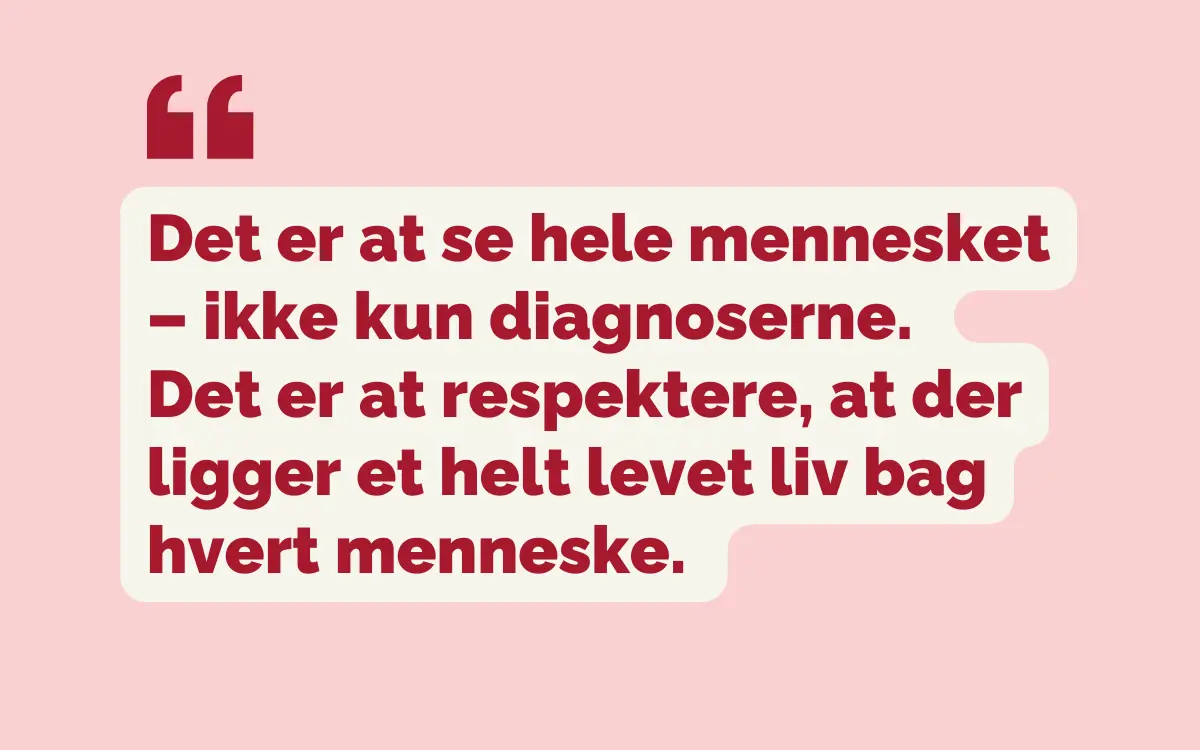 Det er at se hele mennesket – ikke kun diagnoserne. Det er at respektere, at der ligger et helt levet liv bag hvert menneske. Det er at møde mennesker dér, hvor de er – også når de er sårbare, frustrerede eller bange.