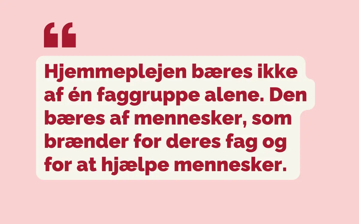 Hjemmeplejen bæres ikke af én faggruppe alene. Den bæres af mennesker, som brænder for deres fag og for at hjælpe mennesker.