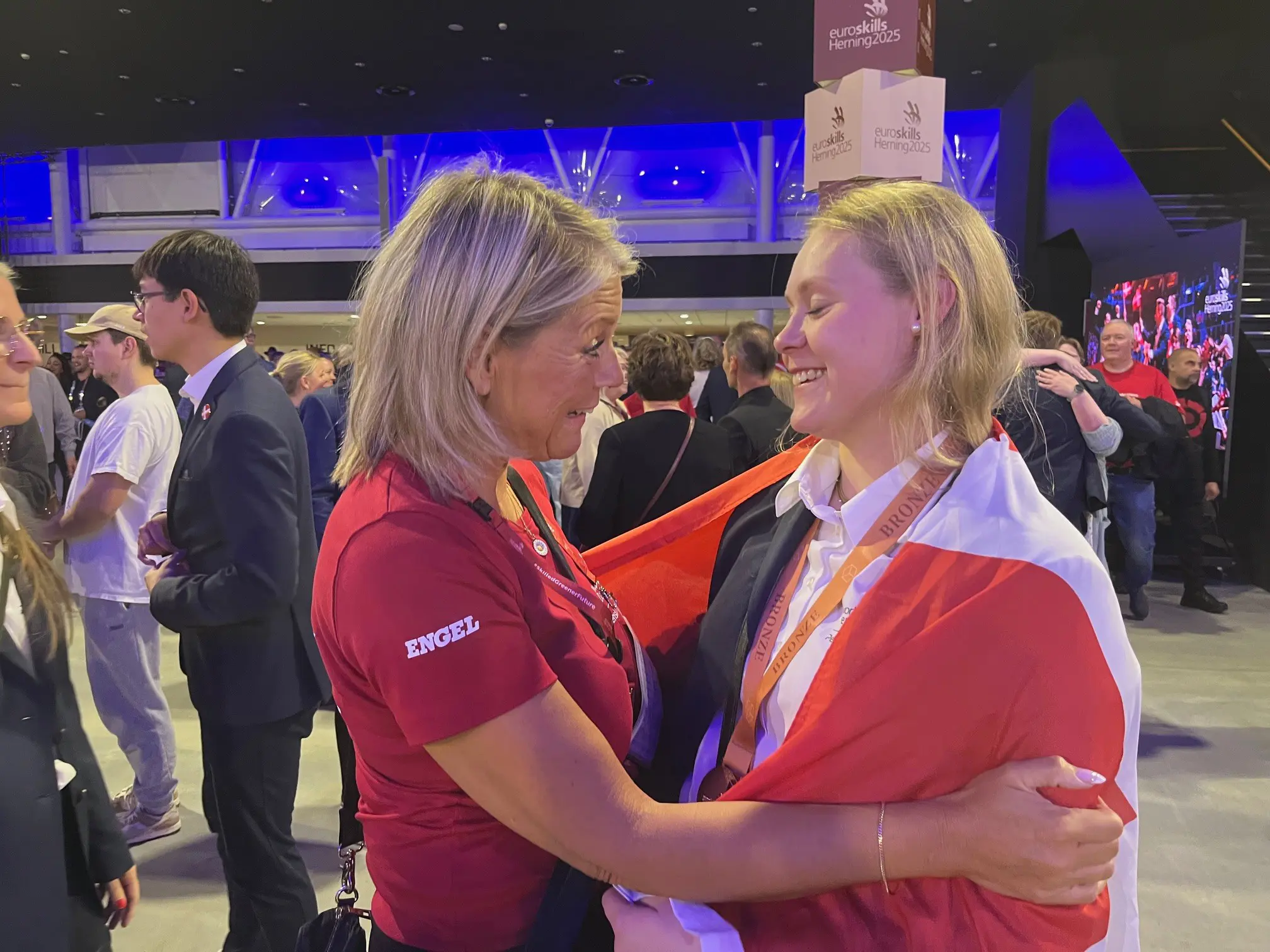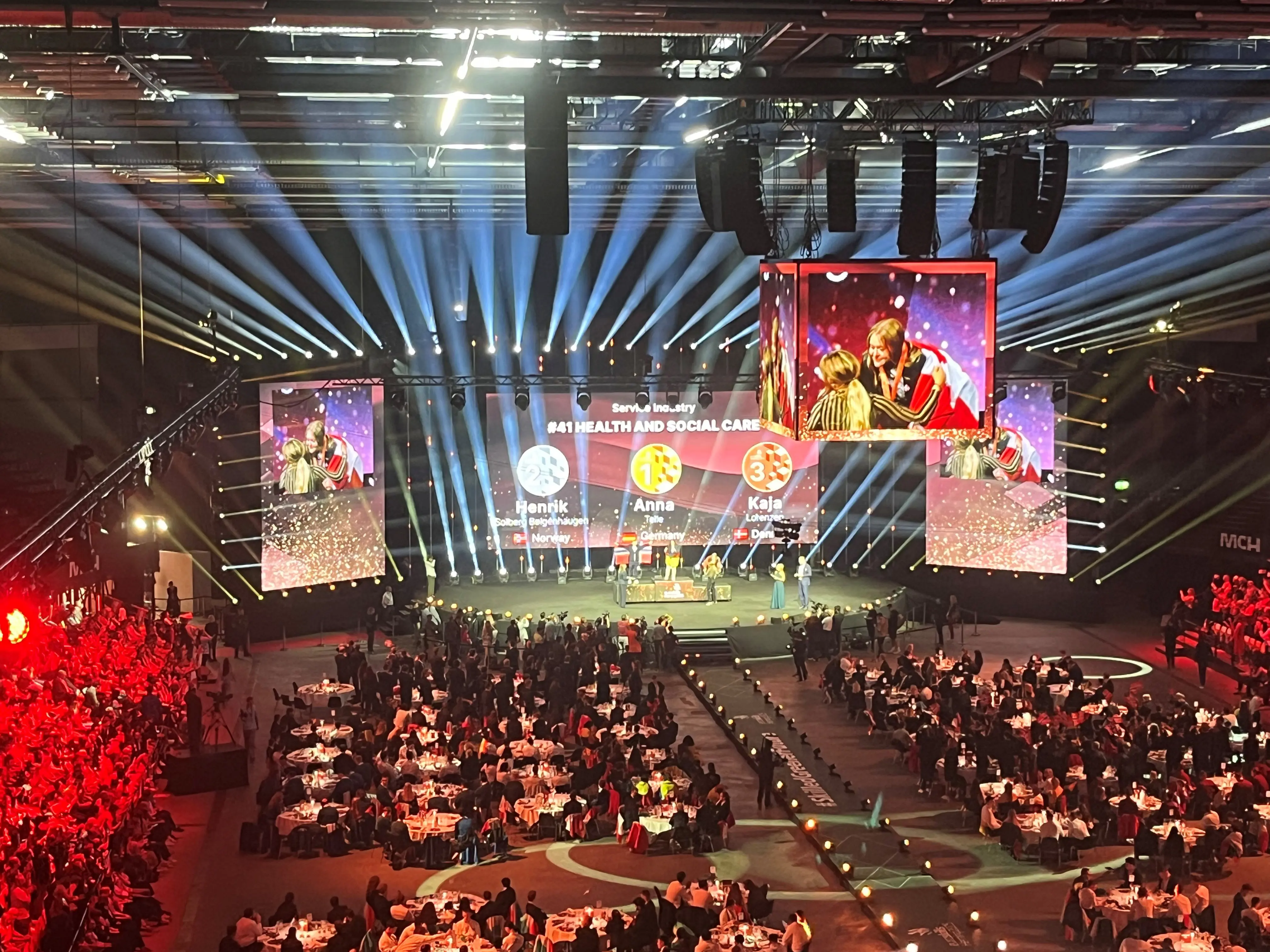 Det var de rutinerede og veloplagte værter Josephine Høgh og Christian Degn, der kunne afsløre den danske sosu-triumf fra scenen, og straks derefter røg hele den danske Skills-delegation i vejret fra deres stole.