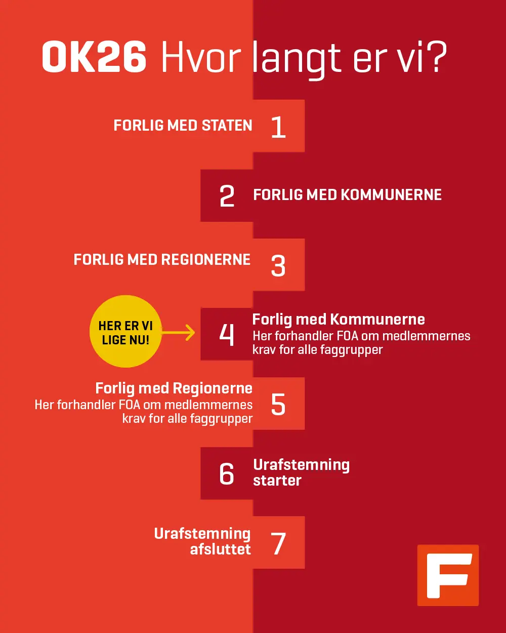 - Når FOA er i mål med både kommuner og regioner, skal FOAs hovedbestyrelse godkende det samlede resultat. Herefter bliver det sendt til urafstemning blandt FOAs medlemmer, som kan stemme ja eller nej til aftalen. Inden afstemningen vil medlemmer blive inviteret til webinarer, hvor de kan høre mere om resultatet og stille spørgsmål til forhandlerne. Senere vil medlemmer også kunne finde flere detaljer om resultatet for deres egen faggruppe ved at logge ind på foa.dk.